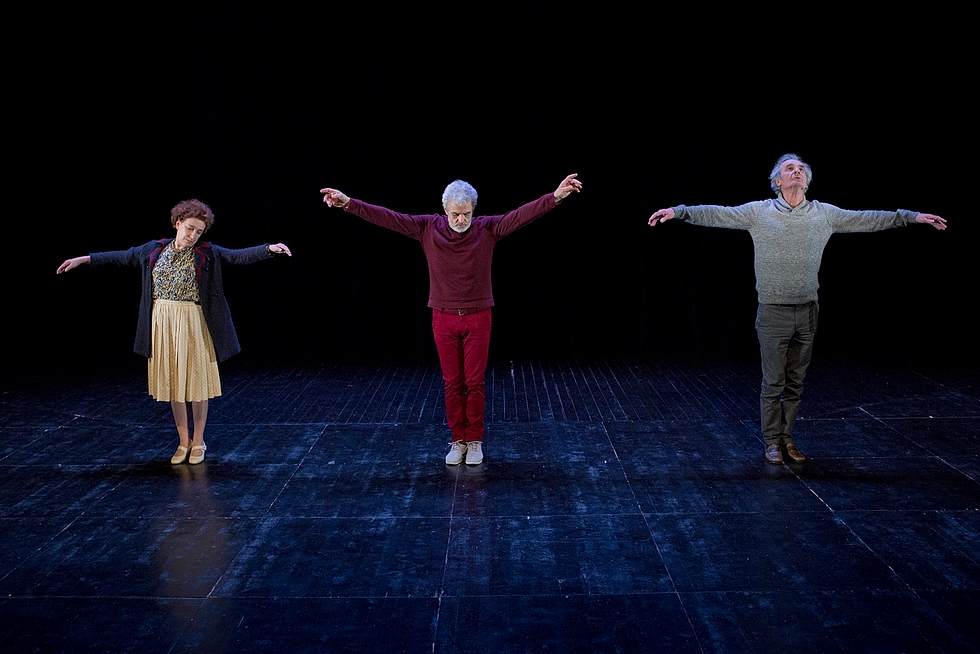Les trois personnages au fil des postures et des mots, des saynètes, des collages de textes, entrent en vieillesse comme en grâce. Les comédiens, comme fondus, enchaînés l'un à l'autre, développent un art paradoxal.