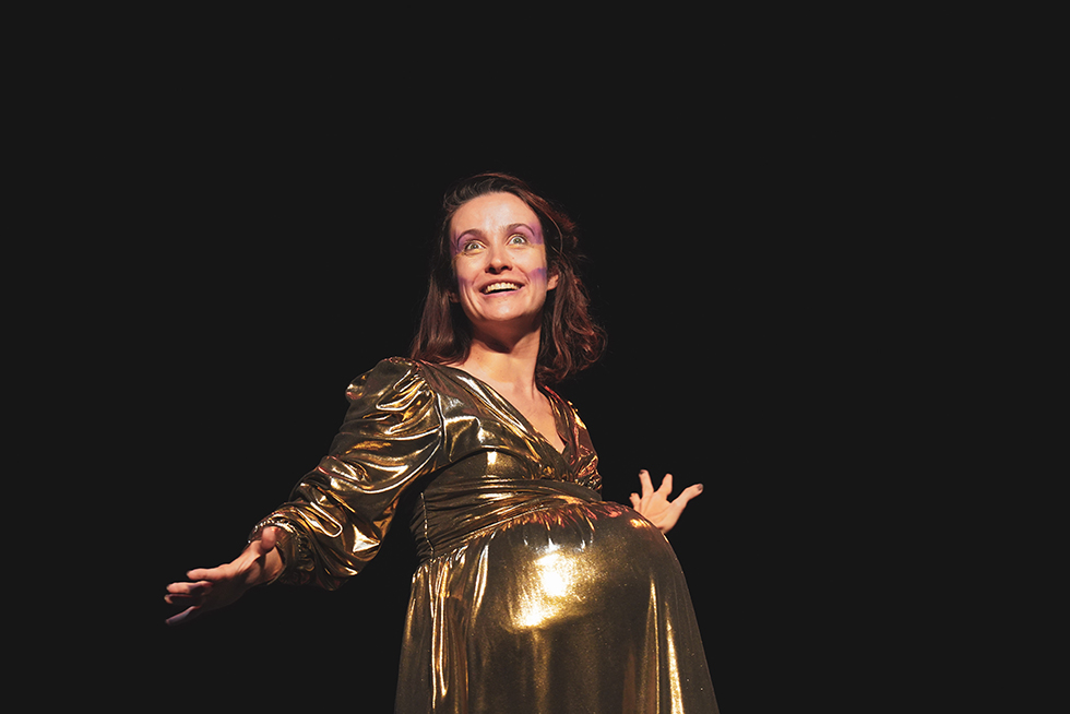 Se découpant de l'obscurité où elle était plongée, une radieuse reine (Julie Papin) apparaît en tenue d'apparat. Mise en lumière dans son imposante robe d'un doré scintillant, elle trône en majesté. Le visage béat d'une illuminée, le ventre rebondi à souhait, enceinte jusqu'aux yeux qu'elle a magnifiques, elle accouche… d'une souris ! Comme ce n'était pas là visiblement l'élue attendue, elle la rejette, le ventre restant toujours aussi protubérant… Une entrée en matière peu suspecte de conformisme pour introduire à d'autres dimensions du même genre…