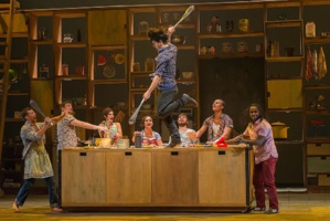 L'astucieux décor - cuisine, plan de travail et/ou table se glissant (sur roulettes) dans l'immense étagère abracadabrantesque montée en fond de scène - se module, se métamorphose en fonction des besoins culinaires ou acrobatiques, table dressée pour dégustation ou tremplin pour sauts acrobatiques élaborés.