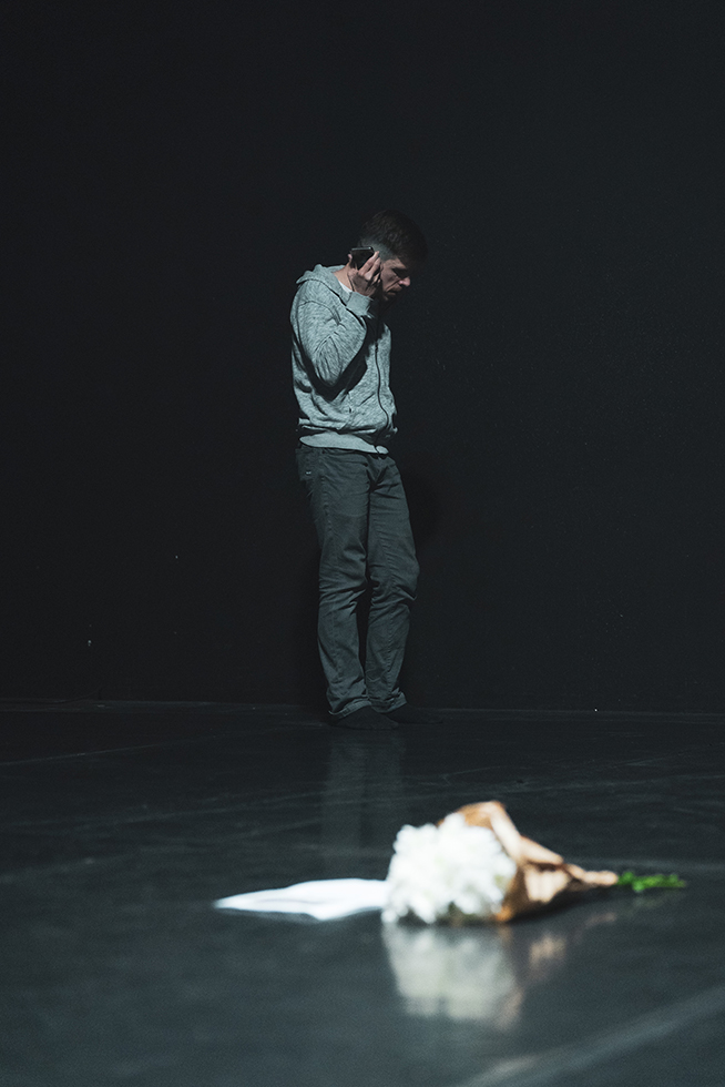 D'emblée, entre réalité et fiction, l'acteur secoué par les sanglots qui le gagnent lit une lettre d'un amant lui annonçant son suicide par pendaison, "dans le verger" précise-t-il. Ayant laissé se confondre "baiser et s'aimer", l'ami désespéré propose sa propre fin comme début du spectacle… Musiques et lumières stéréoscopiques découvrent alors une table ronde, tendue d'une nappe blanche, avec trois chaises disposées autour, l'acteur occupant la centrale…