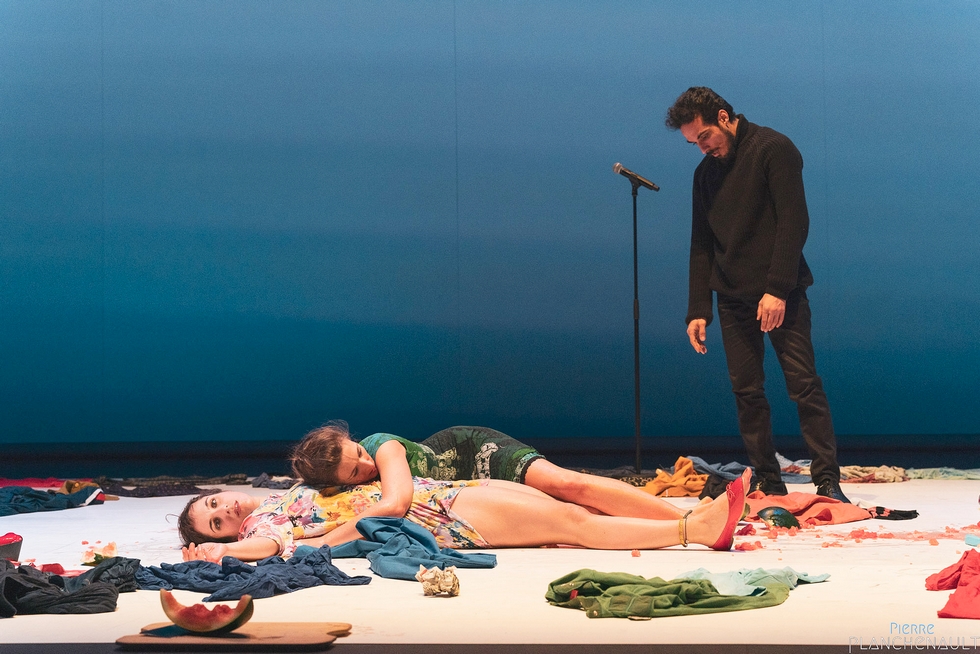 Traversant des rangées de vêtements colorés étalés à même le sol, l'auteur interprète dépose sur l'avant-scène un bocal contenant deux poissons rouges, Sabra et Chatila. Deux jeunes femmes, surfant entre les habits, dansent frénétiquement sur les musiques des années quatre-vingt. Quand elles s'arrêtent, c'est pour photographier les dépouilles au sol. Au micro, les mots de Jean Genet : "La photographie ne saisit pas les mouches ni l'odeur blanche et épaisse de la mort. Elle ne dit pas non plus les sauts qu'il faut faire quand on va d'un cadavre à l'autre".