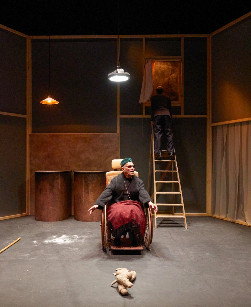 Frédéric Leidgens, cloué au fauteuil, les yeux opaques, est la présence vertigineuse de Hamm au centre du plateau, exactement au centre du monde comme le noyau dans une cellule d'un corps beaucoup trop vaste pour en avoir perception. Ses mains, mais surtout sa manière de dire ce texte et cet affût où s'agite perpétuellement sa tête en fait un personnage entre insecte et mécanique, impressionnant.