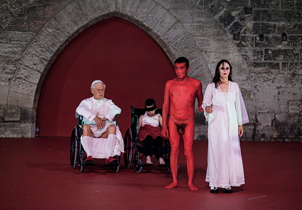 Succédant à la traversée liminaire d'un Pape (Jean-Paul II dont les funérailles ont inspiré Bergman pour anticiper les siennes célébrées ce soir) vêtu d'une soutane blanche, contemplant d'un air dubitatif et dans un silence de mort l'impressionnante façade de "son" Palais, Angélica Liddell fait son entrée, revêtue, elle, d'un déshabillé immaculé s'ouvrant généreusement sur sa nudité vespérale. Alors que derrière les fenêtres éclairées de l'imposante façade se profilent les fantômes des corps violés et torturés, avant d'avoir été précipités du haut de la Tour de la Glacière (massacre de la nuit du 16 au 17 octobre 1791), l'officiante dresse silencieusement un bidet au centre de la scène, le remplit d'un broc d'eau et se lave tranquillement le cul nu exposé généreusement face au public, avant d'aller jeter rageusement son contenu sur la façade souillée par le sang des victimes. Un acte de purification renvoyant à leur hypocrisie ceux pratiqués par l'Église catholique apostolique et romaine.
