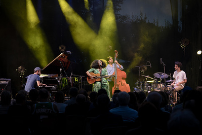 À noter que, pour le concert au Château de Pommorio à Tréveneuc, nous avons invité Brieuc Stievenard, un trompettiste habitant à Rennes. Nous l'avions rencontré lors d'un concert au Coota, il y a un an. Il avait joué alors avec nous. Depuis, il a continué à faire quelques dates avec nous, en invité, notamment au Duc des Lombards à Paris. Nous avons écrit un morceau avec lui qui sera sans doute dans un prochain album. Donc, le fait qu'il soit présent avec nous à Jazz Ô Château en Bretagne a du sens !