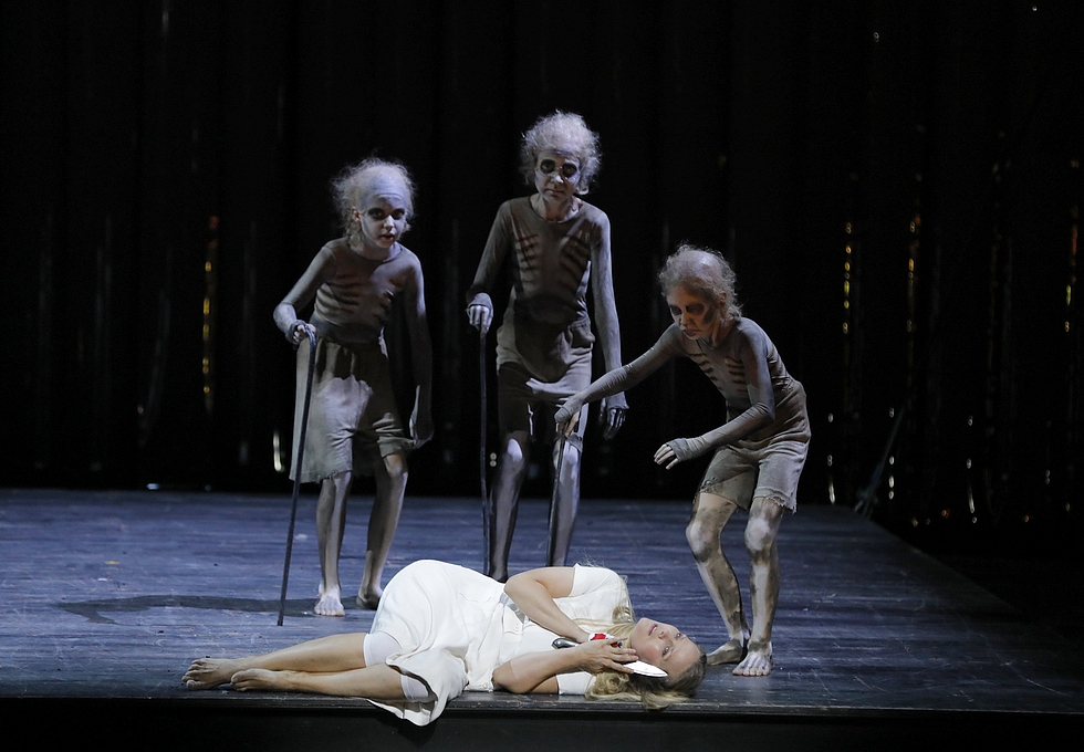 Originalité notable, la fosse de l'orchestre a été considérablement remontée et prolonge cette dernière en pente douce. On ne tardera pas à constater que les musiciens seront mis à contribution dans le jeu, de même que les spectateurs des premiers rangs. La vidéo filme en temps réel traces écrites ou chanteurs, les dessins à la craie, les incrustations d'images, tout cela projeté sur un écran ou en fond de plateau. Un travail sonore très sophistiqué ajoute au dispositif qui viendra donc habiller la scène ; de même que les multiples orientations du plancher suspendu évoqueront les divers lieux de la fiction.