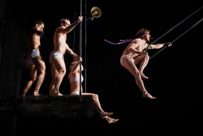 Mais la vie est beaucoup trop tragique ("Dieu est mort, Nietzsche est mort, et moi-même je ne me sens pas très bien", dixit Woody Allen) pour la prendre (trop) au sérieux. Aussi les comédiens circassiens vont-ils rivaliser de drôleries, harponnant au sens propre les deux pontons en les reliant entre eux par leurs allées et venues aériennes. Suspendus au trapèze, ils commentent le point mort du ballant comme une faille spatio-temporelle susceptible de rendre concrète l'idée même de contingence. Être ou ne pas être, la vie tout entière suspendue à un point mort… Magnifique allégorie que ce point d'équilibre précaire. Paradoxe "vivant" à jamais irrésolu.
