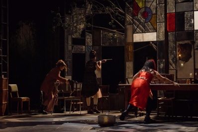 D'abord parler du décor plongé dans une semi-obscurité, lieu d'ombres et de lumières scintillantes, porteur à lui seul d'une intrigue foisonnante tissée de niveaux se recouvrant les uns les autres. Perdue au milieu d'une île indéterminée, une villa décrépite en cours de délitement où des feuillages s'invitent, crevant les murs, comme si la végétation entendait reprendre ses droits sur la civilisation des hommes. Elle a pour nom cette étrange bâtisse, "La Scalognata"… la poisse. Ses étranges occupants seront joués (mis en musique et chantés) par les Dakh Daughters, leurs voix sublimes et leur tonicité à tout rompre créant une atmosphère diabolique ; accompagnées de vrais et faux pantins, elles scanderont l'action de leurs rythmes endiablés aux pouvoirs enchanteurs.