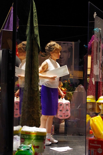 Au fur et à mesure que le temps fait du surplace, le plateau se mue en capharnaüm géant. Les récipiendaires travaillent sans relâche pour créer cette richesse qui pompe leur air disponible, réduisant à peau de chagrin leur espace vital. Travail et vie personnelle ne faisant désormais qu'un, le premier ayant phagocyté la seconde, on les voit ainsi déambuler nus ou s'asseoir sur le siège de toilettes aménagées dans l'open space. (Se) remplir, se vider, deux actions complémentaires pour la même fonction : tenter d'échapper au vide abyssal d'existences sans matière. Quelle place pourrait-il rester pour les relations personnelles dans ce temple consacré au travail et à la consommation qui l'autojustifie (et vice-versa) ?