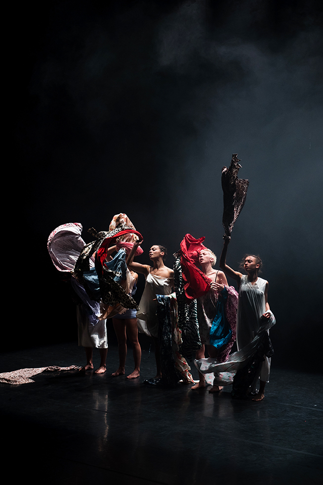 À ce titre, le tableau initial a valeur de peinture expressive, projetant en pleine face les positions canoniques imposées par la loi des hommes… Cinq femmes alignées, impeccablement immobiles face à nous dans leurs longues robes colorées, panel des diversités confondues, émergent de la nuit du plateau. Sur leur visage, dans un silence abyssal, se lit sinon l'effroi l'expression de celles qui se doivent de se tenir en retrait. Lorsque leurs mains se portent lentement à leur visage, c'est pour en effleurer le front… Elles qui, toutes sur le même front, vont peu à peu se mettre en mouvement entre souffrance, révolte et extase.