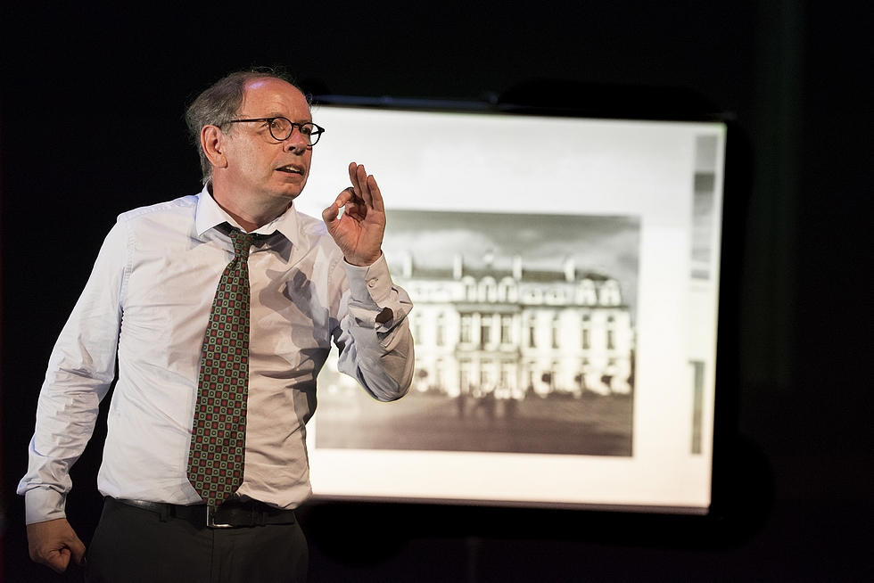 Hervé Le Tellier, le nom aussi de l'auteur de la pièce, est interprété par Olivier Broche et ne fait pas mystère de ses préférences politiques. Les grands discours ne servent à rien. Le cadre dans lequel est encadrée la photo des présidents en fait foi. Grande pour Mitterrand, un peu moins pour Chirac, très petite pour Sarkozy et bancale pour Hollande. Mâtiné d'une fausse naïveté, Le Tellier, l'auteur et le personnage, nous convie ponctuellement dans les méandres de l'Histoire. Quelques clins d'œil à l'actualité de l'époque sont effectués. Au travers de la mythomanie du personnage, la pièce s'attache aussi à montrer la personnification de la politique dont le style est l'homme même, pour reprendre Buffon.