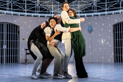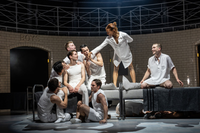Rideau sur un décor en briques blanches avec, côté jardin, une entrée avec des barreaux blancs surplombée par l'inscription "GIRLS" et, côté cour, la même entrée avec "BOYS" au-dessus. Au centre, une porte neutre et blanche. Nous sommes dans le "Verona Institute", établissement ajouté à la trame de la tragédie shakespearienne pour nous plonger dans un espace-temps qui n'est pas celui de Vérone du XVIe siècle. La scénographie avec ses murs propres, blancs et les costumes de Lez Brotherston nous plongent dans une époque très moderne, voire futuriste, où la haine entre clans familiaux est prorogée par l'institution policière jusqu'à empêcher une passion amoureuse, celle de Roméo et Juliette.