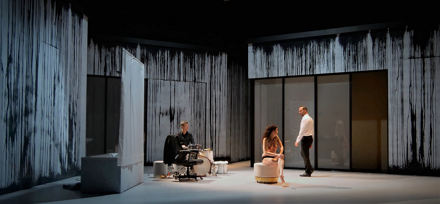 Rock and Roll ! Il y a dans "Toute Nue" un rythme effréné que les comédiens assurent tout au long du jeu en occupant tous les recoins du plateau, in et off. Il y a aussi un batteur, au centre de la scène, qui suit les mouvements des acteurs ou les prolongent. Et il y a un décor sur lequel nous sommes, spectateurs, tous tombés d'accord : superbe ! Un décor rock, gris métal et aéré. Nouvelles technologies obligent, le futur ministre reçoit des appels vidéo, le maire arrive avec son Mac Book, les costumes sont tendance et la femme élégamment vêtue se dresse et entre en résistance ! Tenue coquette qu'elle va progressivement enlever, il fait si chaud !